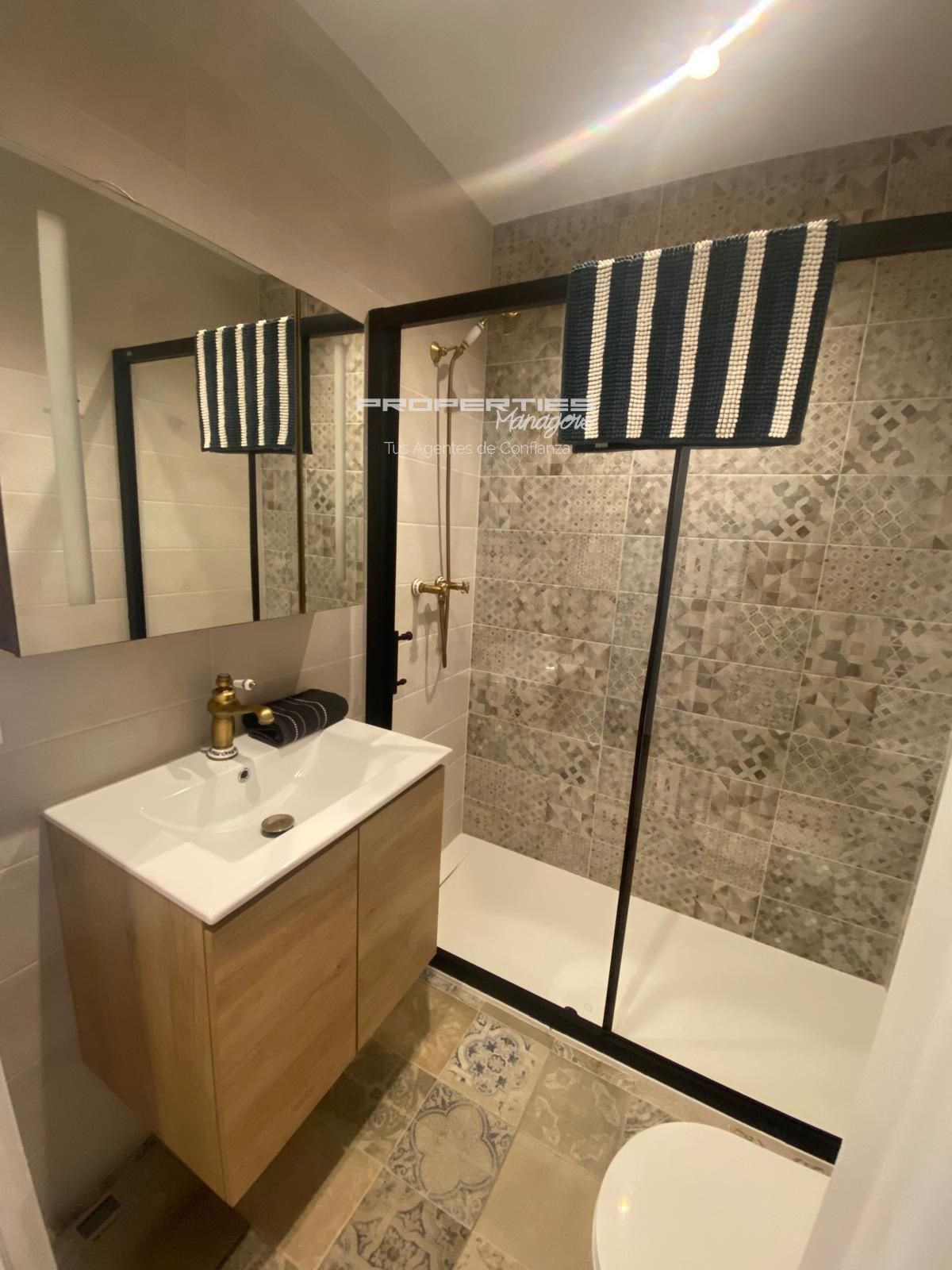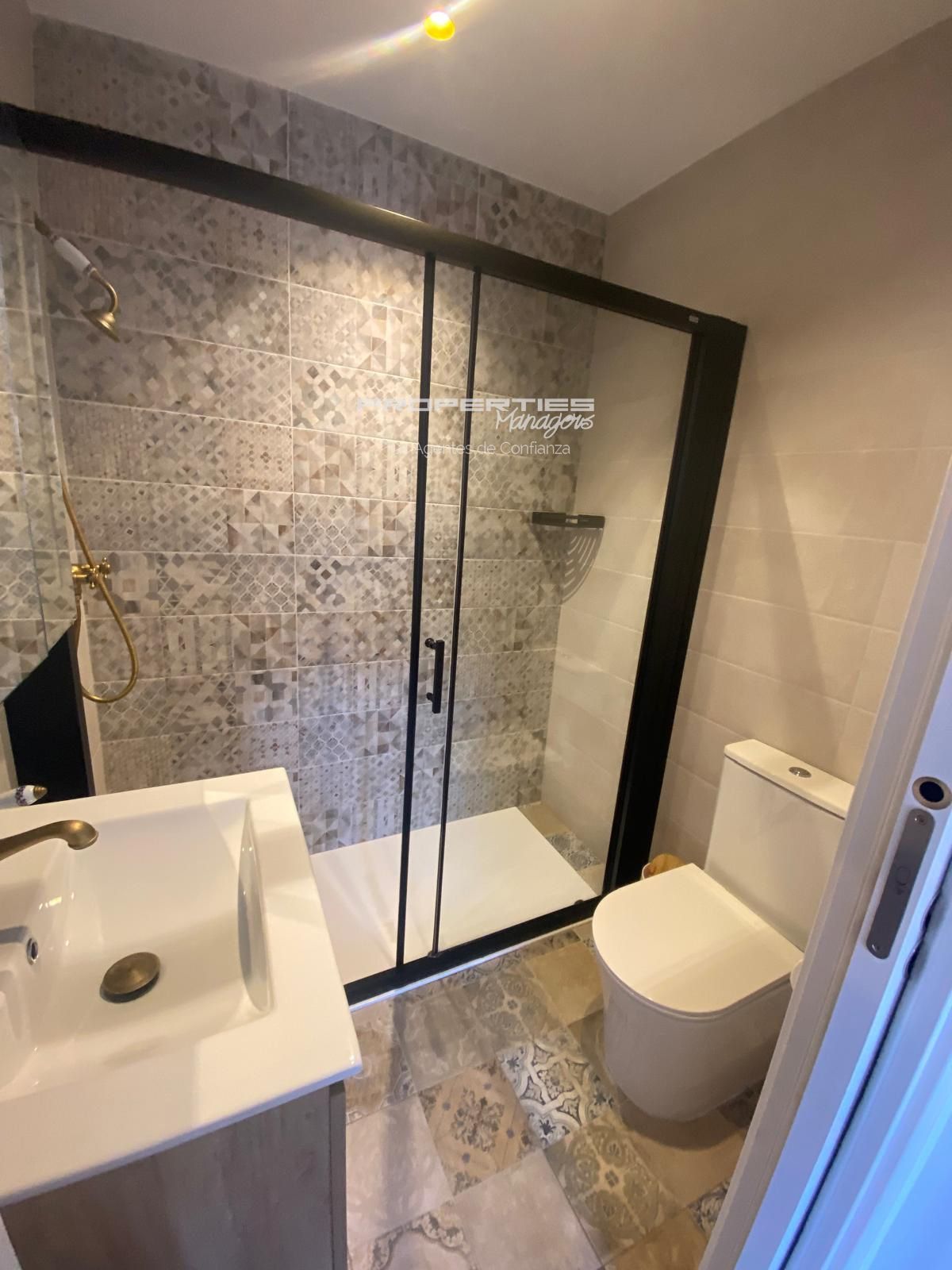 Se alquila bonita y luminosa habitación doble con litera, baño privado no compartido, terraza propia, gran armario y aire acondicionado, situada en una planta baja de vivienda reformada con diseño moderno.