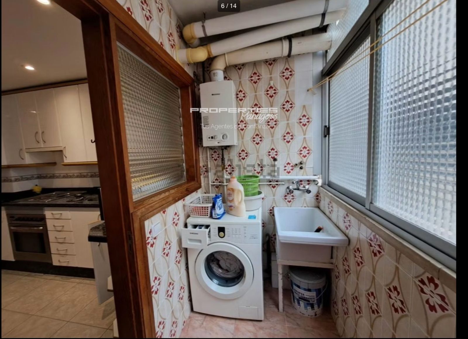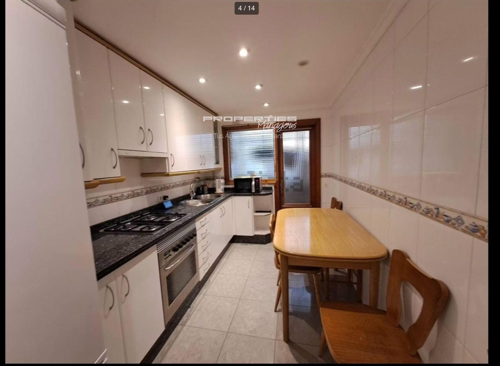 La cocina es independiente, totalmente equipada con electrodomésticos (horno, fogones, microondas, nevera) y dispone de una práctica zona de comedor. También incluye un espacio de lavandería con lavadora y pila.
